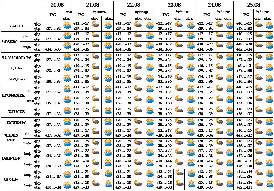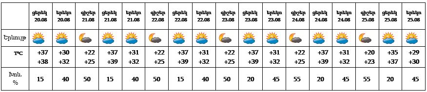 Հանրապետության տարածքում օգոստոսի 20-ի ցերեկը, 21-25-ը սպասվում է առանց տեղումների եղանակ: Քամին՝ հարավային՝ 3-8 մ/վ: Օդի ջերմաստիճանն էապես չի փոխվի։