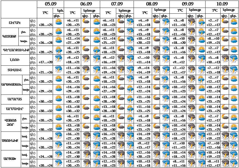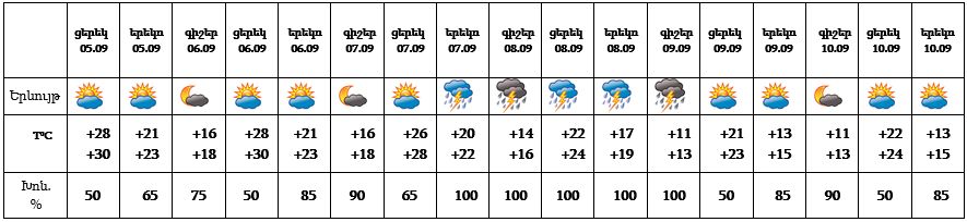 Երևան քաղաքում՝ սեպտեմբերի 5-ի ցերեկը, 6-ին, 9-ի ցերեկը, 10-ին սպասվում է առանց տեղումների եղանակ, 7-8-ը, 9-ի գիշերը սպասվում է անձրև և ամպրոպ, ամպրոպի ժամանակ հնարավոր է քամու ուժգնացում՝ 15-20 մ/վ: