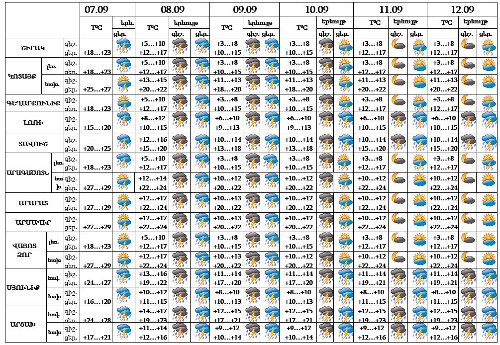 Հանրապետության տարածքում՝ սեպտեմբերի 7-10-ը շրջանների զգալի մասում, 11-12-ն առանձին շրջաններում սպասվում է անձրև և ամպրոպ, Լոռիում, Տավուշում, Սյունիքում և Արցախում՝ նաև մառախուղ:
