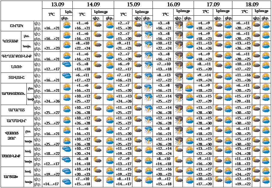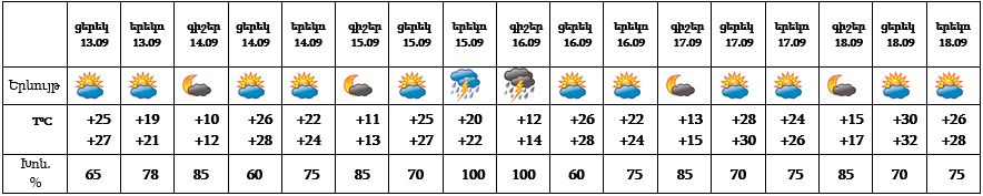 Երևան քաղաքում՝ սեպտեմբերի 13-ի ցերեկը, 14-ին, 15-ի գիշերը, 16-ի ցերեկը, 17-18-ը սպասվում է առանց տեղումների եղանակ: Սեպտեմբերի 15-ի ուշ երեկոյան ժամերին, 16-ի գիշերը սպասվում է անձրև և ամպրոպ, ամպրոպի ժամանակ հնարավոր է քամու ուժգնացում՝ 15-20 մ/վ։.jpg?1568366639703)