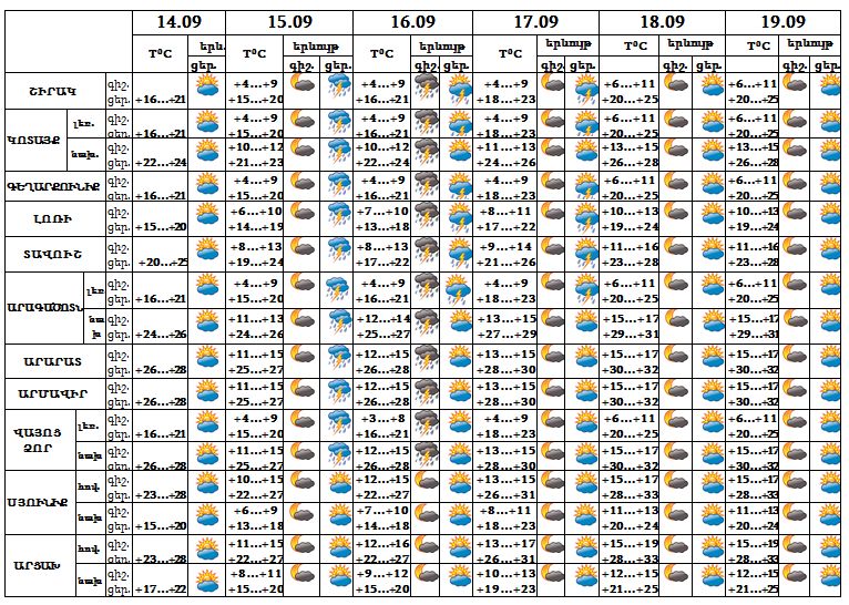 Հանրապետության տարածքում՝ սեպտեմբերի 14-ի ցերեկը, 15-ի գիշերը, 17-ի գիշերը, 18-19-ը սպասվում է առանց տեղումների եղանակ, 15-ի ցերեկը, 16-ին, 17-ի ցերեկն առանձին շրջաններում սպասվում է անձրև և ամպրոպ: