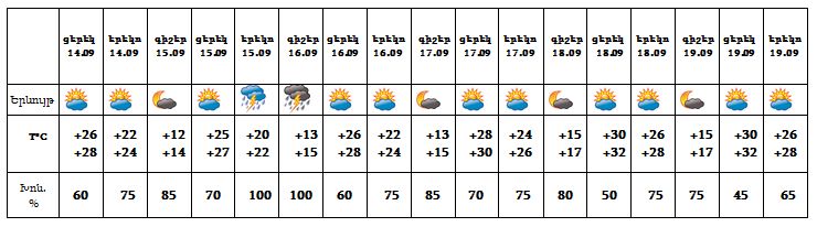 Երևան քաղաքում՝ սեպտեմբերի 14-ի ցերեկը, 15-ի գիշերը, 16-ի ցերեկը, 17-19-ը սպասվում է առանց տեղումների եղանակ: Սեպտեմբերի 15-ի ուշ երեկոյան ժամերին, 16-ի գիշերը սպասվում է անձրև և ամպրոպ, ամպրոպի ժամանակ հնարավոր է քամու ուժգնացում՝ 15-20 մ/վ։