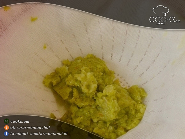 3. Խաղողից ստացված չեչը լցնում ենք 2-3 շերտ ծալած թանզիֆի մեջ ու քամում ենք մնացած հյութը։