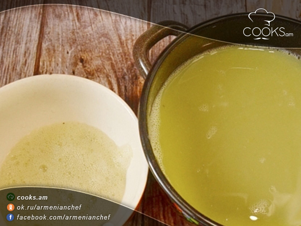 4. 1 լ հյութին ավելացնում ենք 150 մլ ջուր, հեռացնում ենք մակերեսին առաջացած փրփուրն ու դնում ենք կրակի վրա։