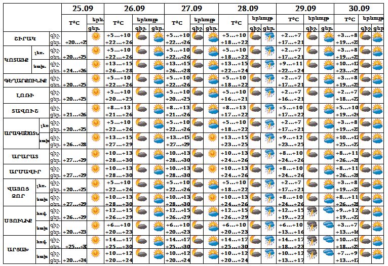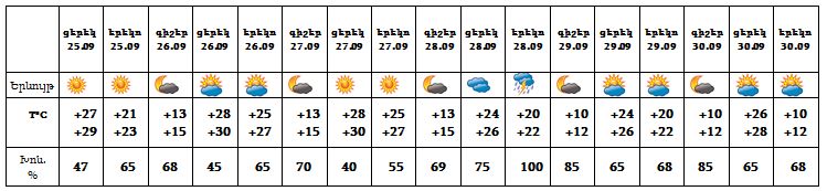 Օդի ջերմաստիճանը սեպտեմբերի 25-ի ցերեկը, 26-ին աստիճանաբար կբարձրանա 1-2 աստիճանով, 28-ի ցերեկը և 29-ի գիշերը կնվազի 3-5 աստիճանով։