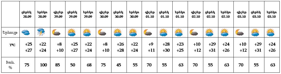 Սեպտեմբերի 28-ի ցերեկը հանրապետության շրջանների զգալի մասում սպասվում է անձրև և ամպրոպ: 28-ի գիշերը, 29-30-ը, հոկտեմբերի 1-3-ը սպասվում է առանց տեղումների եղանակ: Քամին՝ հյուսիս-արևելյան՝ 3-8 մ/վ, ամպրոպի ժամանակ սպասվում է քամու ուժգնացում՝ 15-20 մ/վ: