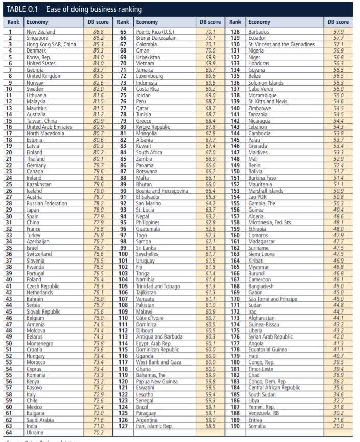 Առաջին և երկրորդ տեղերը զբաղեցրել են Նոր Զելանդիան և Սիգապուրը: Ցանկում երրորդը Հոնկոնգն է՝ Դանիային թողնելով 4-րդ հորիզոնականում: Հաջորդում են Հարավային Կորեան, ԱՄՆ-ն, Վրաստանը, Մեծ Բրիտանիան, Նորվեգիան, Շվեդիան: