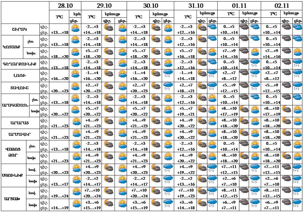 Հանրապետության տարածքում՝ հոկտեմբերի 28-ի ցերեկը, 29-ին սպասվում է առանց տեղումների եղանակ, 30-31-ը, նոյեմբերի 1-2-ը հատկապես Լոռիում, Տավուշում, Սյունիքում և Արցախում սպասվում է թույլ անձրև:
