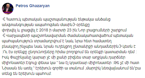 «Մեդիա Պաշտպան» նախաձեռնությունը հայտարարություն է տարածել, որում նշվում է, որ համացանցից տեղեկացել է, որ Հանրային Հեռուստաընկերության լրատվական բաժնի ղեկավար Պետրոս Ղազարյանը փորձել է արդարացնել ՀՀ վարչապետի դստեր՝ Մարիամ Փաշինյանի համար պետական միջոցներով ավտոմեքենա գնելու հանգամանքը։