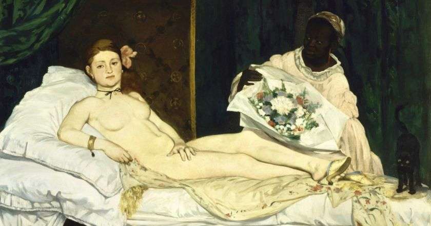 Մանեն իր «Օլիմպիա» նկարում պատկերել է մերկ մի կնոջ, ով Վեներայի պատկերն ունի։ Նա պառկած է անկողնուն, իսկ նրա կողքին սևամորթ մի կին է կանգնած։ 1865թ․-ին, երբ նկարը ցուցադրվեց Փարիզում, ու պատմվեց դրա պատմությունը, արվեստասերները չկարողացան զսպել իրենց զայրույթն ու անգամ առաջարկեցին վառել այն։