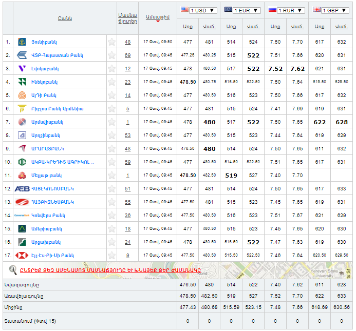 Ամերիկյան մեկ դոլարը գնվում է 476.50 դրամ նվազագույն և 476.50 դրամ առավելագույն փոխարժեքով, վաճառվում՝ 480 դրամ նվազագույն և 482.50 դրամ առավելագույն փոխարժեքով: