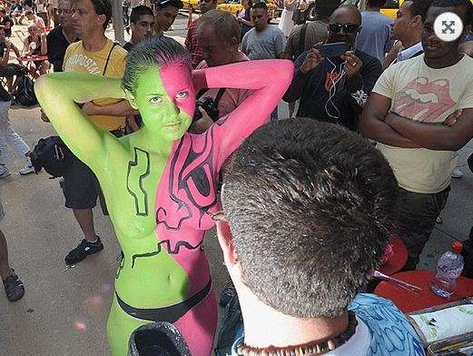 Երբ Գոլուբը ավարտել է մոդելների մարմինը պատել ներկերով, մոդելները սկսել են շփվել մարդկանց հետ և իրենց ձևացրել իբրև տաքսի կանգնեցնող զույգ: