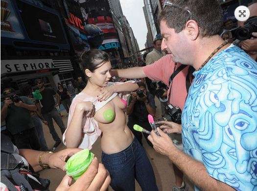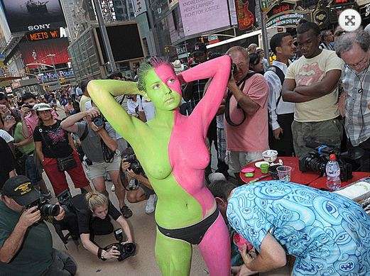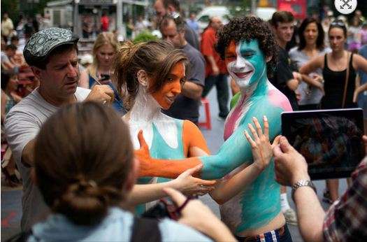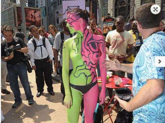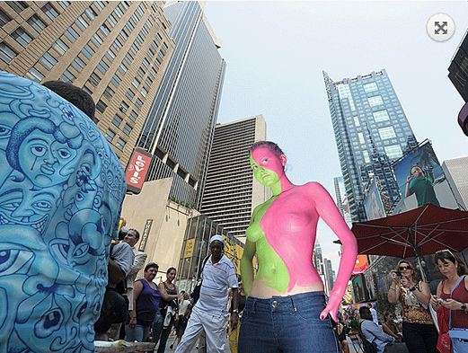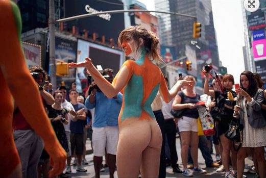 Նյու Յորքի իշխանությունների թույլտվությամբ այս շաբաթ երկարատև ընդմիջումից հետո նկարիչ Էնդի Գոլուբը Թայմս սքվեր հրապարակում կրկին «հոգեցունց ներկայացում է» ցուցադրել: Հանրային բոդի արտի համար որպես մոդել հանդես են եկել 21-ամյա Ջիաննա Ջեյմսը և 23-ամյա Էթան Իցկովը: