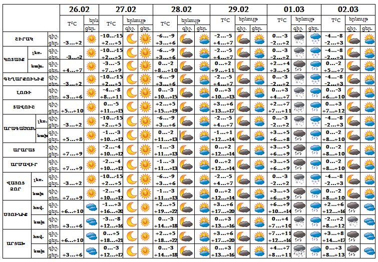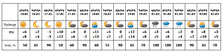 Հանրապետության տարածքում՝ փետրվարի 26-ի ցերեկը, 27-29-ը, մարտի 2-ի ցերեկը սպասվում է առանց տեղումների եղանակ։ Մարտի 1-ին, շրջանների զգալի մասում, 2-ի գիշերը Սյունիքում և Արցախում սպասվում են տեղումներ, լեռնային շրջաններում՝ ձյան, նախալեռնայինում՝ թաց ձյան, հովտային գոտում՝ անձրևի տեսքով: