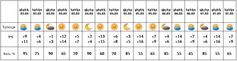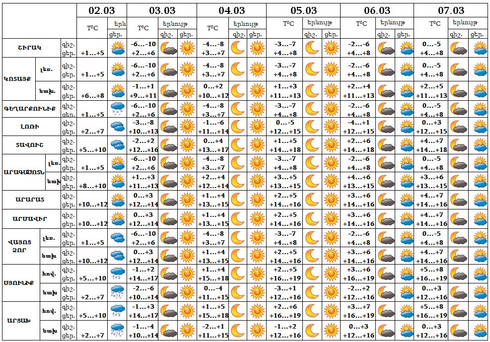 Հանրապետության տարածքում՝ մարտի 2-ի ցերեկն առանձին շրջաններում սպասվում են թույլ տեղումներ։ Մարտի 3-7-ը սպասվում է առանց տեղումների եղանակ։