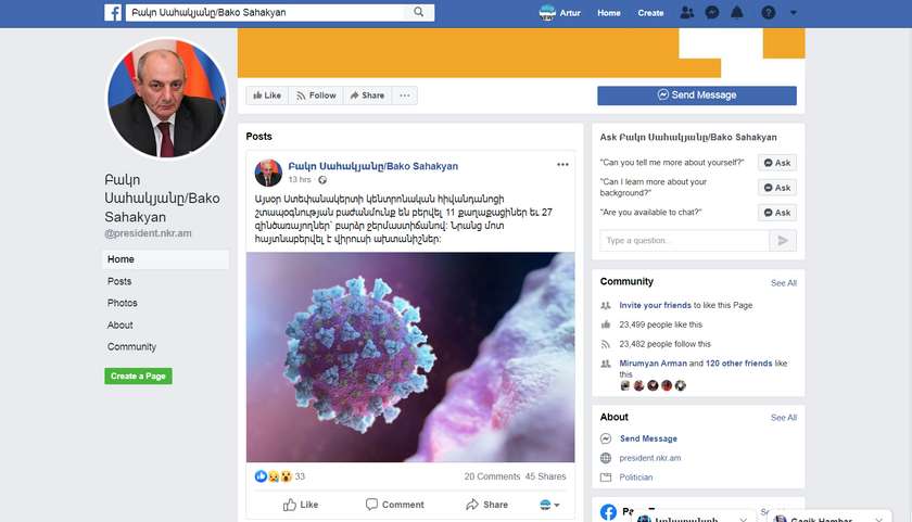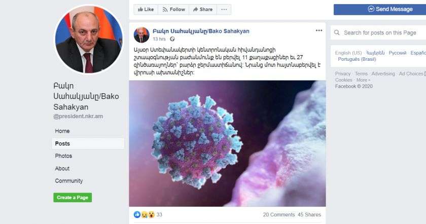 Կրկին Ֆեյսբուք սոցիալական ցանցում Արցախի նախագահ Բակո Սահակյանի անունից կեղծ լուրեր են տարածվում, իբր Արցախում ևս հայտնաբերվել են կորոնավիրուսով վարակված մարդիկ: Ինֆորմացիան կեղծ է, քանի որ Բակո Սահակյանը երբևէ գրանցված չի եղել սոցիալական ցանցերում, առավել ևս՝ Ֆեյսբուքում: Նրա անունով պարբերաբար կեղծ էջեր են բացվում Ադրբեջանից, և նմանատիպ ապատեղեկատվություն տարածում: