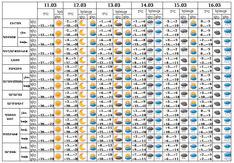 Հանրապետության տարածքում՝ մարտի 11-ի ցերեկը, 12-13-ը, 16-ի գիշերը սպասվում է առանց տեղումների եղանակ։ Մարտի 14-ին, 16-ի ցերեկը շրջանների զգալի մասում, 15-ի գիշերն առանձին շրջաններում, ցերեկը Վայոց ձորում, Սյունիքում և Արցախում սպասվում են տեղումներ: Այս մասին հայտնում են ԱԻՆ-ից: