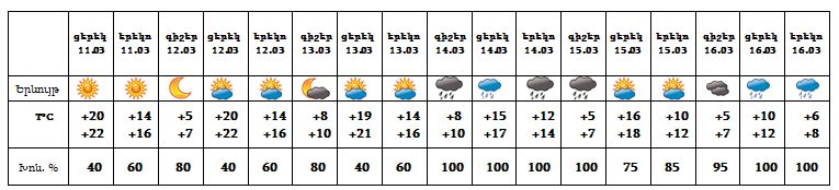Երևան քաղաքում՝ մարտի 11-ի ցերեկը, 12-13-ը, 15-ի ցերեկը, 16-ի գիշերը սպասվում է առանց տեղումների եղանակ։ Մարտի 14-ին, 15-ի գիշերը, 16-ի ցերեկը սպասվում է անձրև։