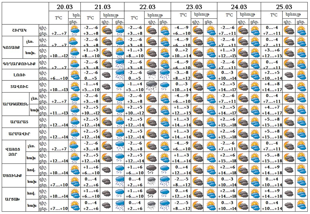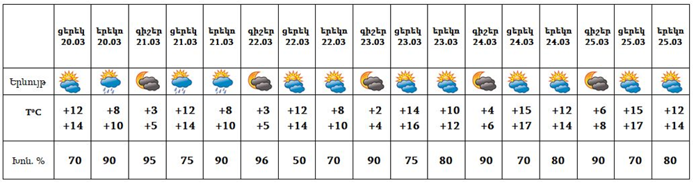 Երևան քաղաքում՝ մարտի 20-ի ցերեկը, 21-ին քաղաքի առանձին հատվածներում սպասվում է կարճատև անձրև և ամպրոպ։ Մարտի 22-25-ը սպասվում է առանց տեղումների եղանակ։