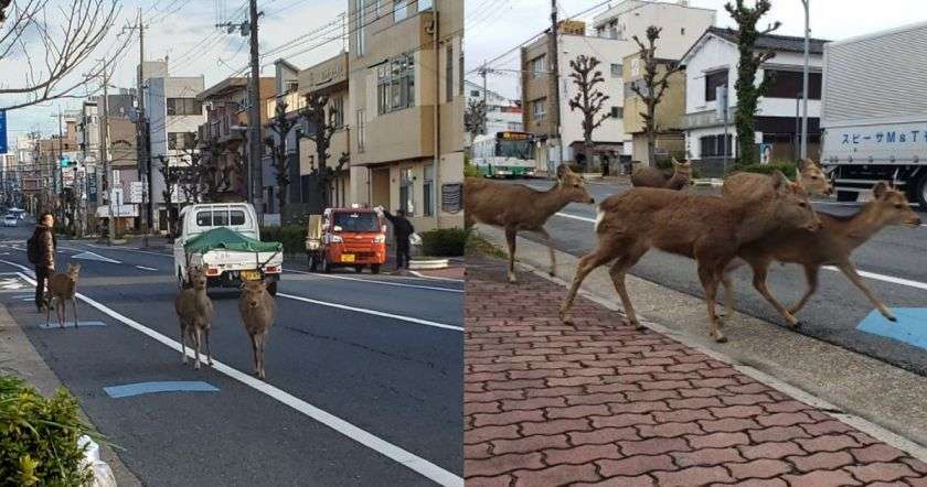 Օրինակ՝ Ճապոնիայում՝ Նարա քաղաքի այգիներում, եղջերուներ կան, որոնք փողոց են դուրս գալիս՝ սնունդ փնտրելու: Սովորաբար այգում շատ զբոսաշրջիկներ էին լինում, քանի որ այնտեղ բնակվող Sika եղնիկը իրական գրավչություն է զբոսաշրջիկների համար: Զբոսաշրջիկները սովորաբար գնում էին այգում վաճառվող կերերը, որոնք հատուկ նախատեսված էին եղնիկներին կերակրելու համար, սակայն քանի որ վերջին շաբաթների ընթացքում այցելուների թիվը քչացել է, եղնիկները կարծես թե այլ ելք չունեն, քան դուրս գալ իրենց տարածքից՝ ուտելիք գտնելու համար:
