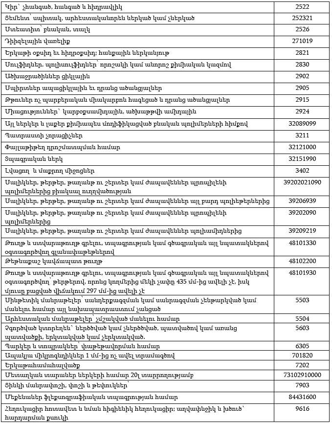 Ընդ որում, հավելվածի առաջինից տասնիններորդ տողերում նշված ապրանքների մասով ապրանքների փոխադրումը թույլատրվում է Պետական եկամուտների կոմիտեի կողմից՝ հիմք ընդունելով Հայաստանի Հանրապետության առողջապահության նախարարության գրավոր համաձայնությունը փոխադրման ենթակա ապրանքատեսակների և դրանց չափաքանակների վերաբերյալ։