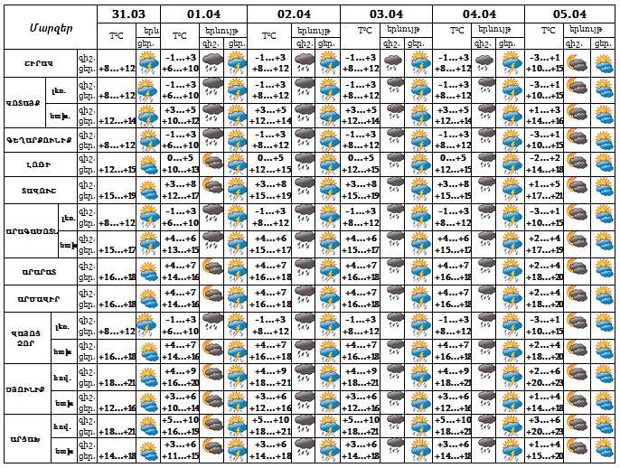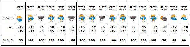 Երևան քաղաքում՝ մարտի 31-ի երեկոյան ժամերին, ապրիլի 1-4-ը ժամանակ առ ժամանակ սպասվում է կարճատև անձրև և ամպրոպ, ամպրոպի ժամանակ հնարավոր է քամու ուժգնացում` 14-17 մ/վ արագությամբ։ Ապրիլի 5-ին սպասվում է առանց տեղումների եղանակ: