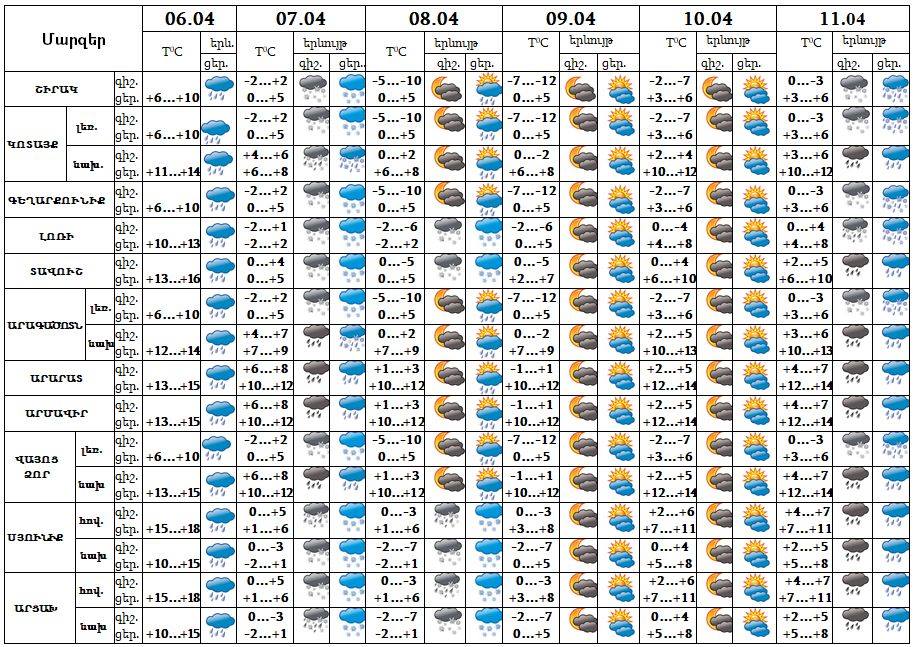 Հանրապետության տարածքում՝ ապրիլի 6-7-ը, 11-ին շրջանների զգալի մասում, 8-ին Լոռիում, Տավուշում, Սյունիքում և Արցախում ժամանակ առ ժամանակ սպասվում են տեղումներ, 7-8-ը լեռնային շրջաններում, Լոռիում, Տավուշում, Սյունիքում և Արցախում՝ ձյան տեսքով։