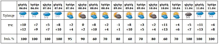Երևան քաղաքում՝ ապրիլի 6-ի ցերեկը, 7-ին, 11-ին ժամանակ առ ժամանակ սպասվում է անձրև։ Ապրիլի 8-10-ը սպասվում է առանց տեղումների եղանակ։