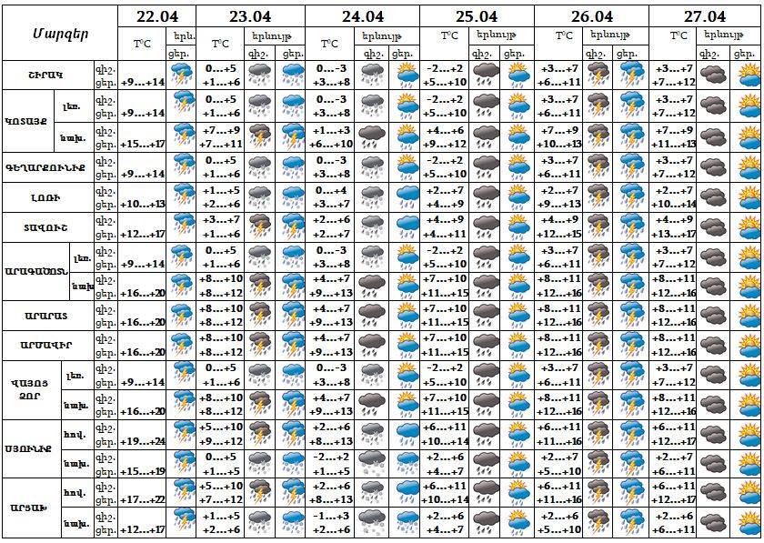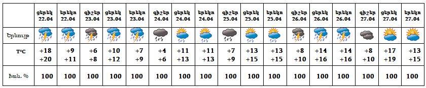 Երևան քաղաքում՝ ապրիլի 22-ի ցերեկը, 23-26-ը ժամանակ առ ժամանակ սպասվում է անձրև և ամպրոպ, ամպրոպի ժամանակ՝ քամու ուժգնացում՝ 15-17 մ/վ։ Ապրիլի 27-ին սպասվում է առանց տեղումների եղանակ: