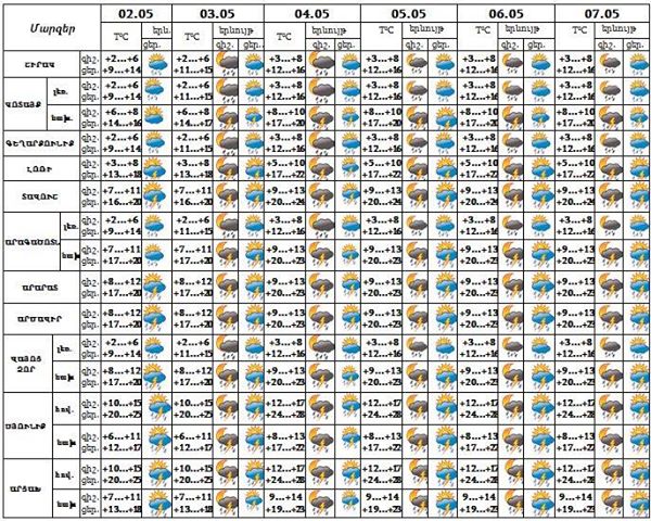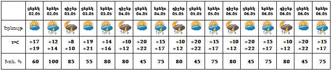 Երևան քաղաքում՝ մայիսի 2-ի կեսօրից հետո, 3-7-ի գիշերը և կեսօրից հետո սպասվում է կարճատև անձրև և ամպրոպ, ամպրոպի ժամանակ հնարավոր է քամու ուժգնացում՝ 15-17 մ/վ։