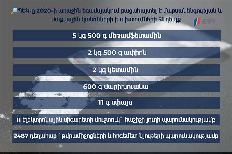 Մասնավորապես` վարչության աշխատակիցները կանխել են տարբեր երկրներից փոստային ճանապարհով, ինչպես նաև ուղեկցող ուղեբեռներով թմրամիջոցների ու հոգեմետ նյութերի ներմուծման և արտահանման մաքսանենգության 34 դեպք: Արդյունքում հայտնաբերվել են շուրջ 5կգ 500գ մեթամֆետամին, 2կգ 500գ ափիոն, ավելի քան 2 կգ կետամին, 600գ մարիխուանա, 11գ սփայս, ինչպես նաև հաշիշի յուղով լցված էլեկտրական սիգարետի 11 մուշտուկ, տարբեր տեսակի թմրամիջոցների և հոգեմետ նյութերի պարունակությամբ 2487դեղահաբ: