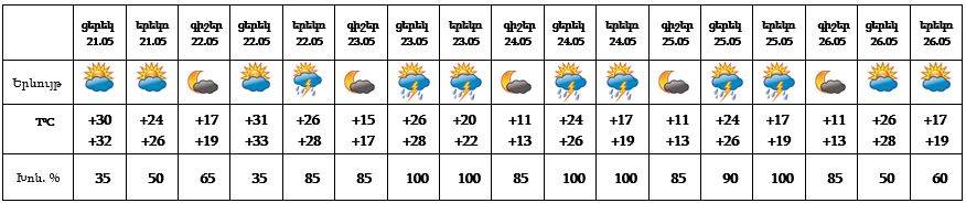 Երևան քաղաքում՝ մայիսի 21-ի ցերեկը, 26-ը սպասվում է առանց տեղումների եղանակ, 22-ին՝ երեկոյան ժամերին հնարավոր է, 23-25-ը՝ կեսօրից հետո սպասվում է կարճատև անձրև և ամպրոպ։