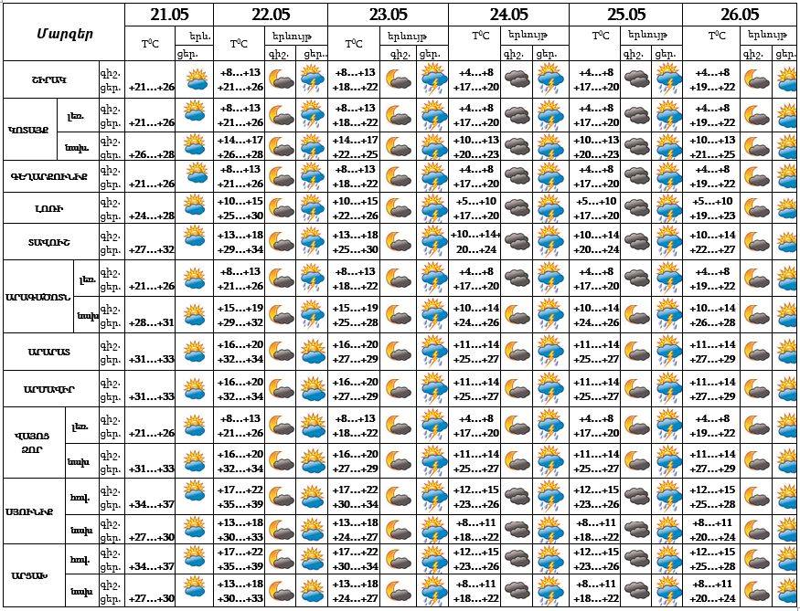Հանրապետության տարածքում՝ մայիսի 21-ի ցերեկը, 26-ը սպասվում է առանց տեղումների եղանակ: Մայիսի 22-ին՝ հյուսիսային շրջաններում, 23-25-ը՝ շրջանների զգալի մասում՝ կեսօրից հետո սպասվում է կարճատև անձրև և ամպրոպ, առանձին վայրերում սպասվում է նաև կարկուտ։ Այս մասին հայտնում են ԱԻՆ-ից։
