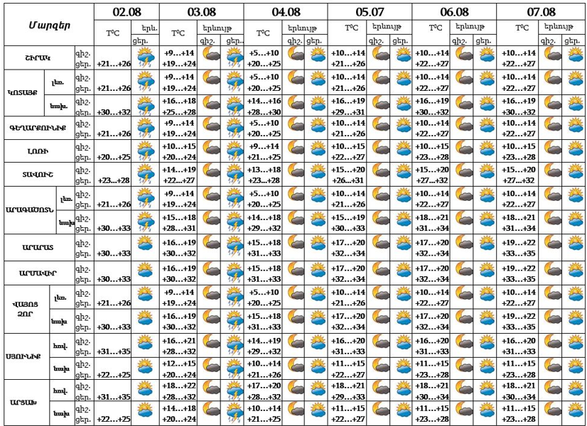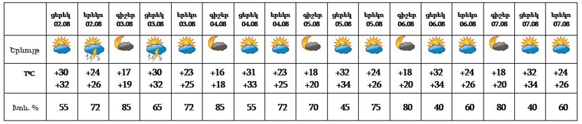 Հանրապետության տարածքում օգոստոսի 2-ի կեսօրից հետո, 3-ին ժամանակ առ ժամանակ շրջանների մեծ մասում սպասվում է կարճատև անձրև և ամպրոպ, ամպրոպի ժամանակ քամու ուժգնացում 20-25 մ/վ արագությամբ: Առանձին վայրերում սպասվում է նաև կարկուտ: