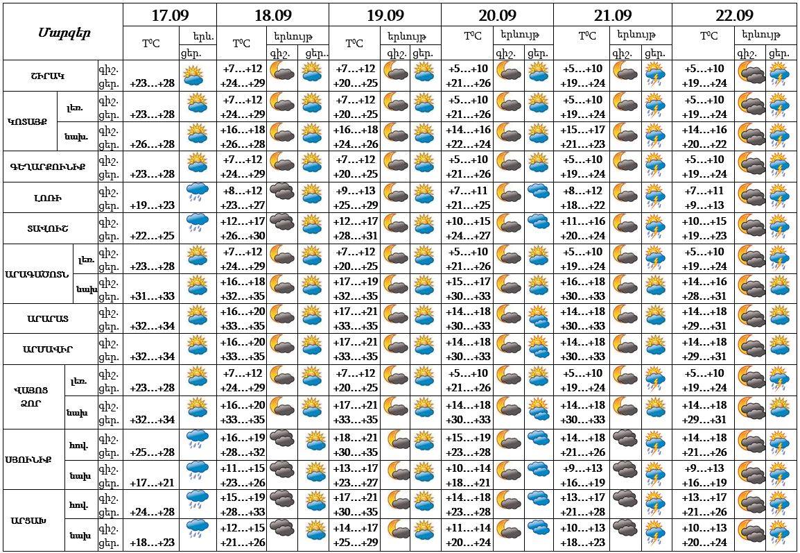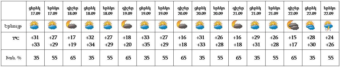 Երևան քաղաքում՝ սեպտեմբերի 17-ի ցերեկը, 18-21-ը սպասվում է առանց տեղումների եղանակ, 22-ին՝ կեսօրից հետո հնարավոր է կարճատև անձրև և ամպրոպ: