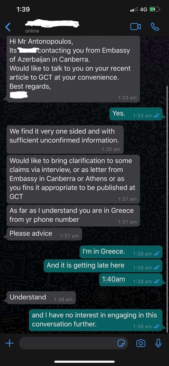 Լրագրողը հրապարակել է Կանբերրայում Ադրբեջանի դեսպանատան աշխատակցի հաղորդագրությունը, որում վերջինս ցանկանում է խոսել Greek City Times-ում հրապարակված լրագրողի հոդվածի մասին՝ այն անվանելով միակողմանի ու բավարար չհաստատված ինֆորմացիայով։