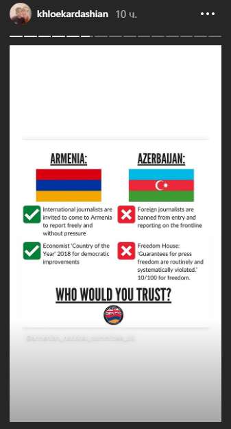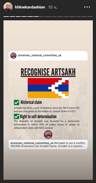 Հայազգի հոլիվուդյան աստղ Քլոե Քարդաշյանը, ով Քիմ Քարդաշյանի քույրն է, իր ինստագրամյան էջում կիսվել է հրապարակմամբ, որը վերաբերում է ներկայիս իրավիճակին: