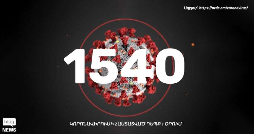 Հայաստանում հոկտեմբերի 17-ի դրությամբ նոր կորոնավիրուսով վարակվելու 1540 նոր դեպք է գրանցվել: Այս մասին հայտնում է ՀՀ ԱՆ հիվանդությունների եւ վերահսկման եւ կանխարգելման ազգային կենտրոնը: