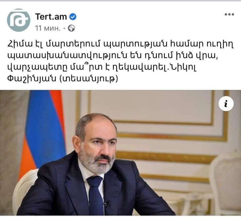 Էս մարդը, ով պարբերաբար ղժղժում էր, թե մեկդ հանկարծ չսխալվեք ու չկասկածեք, ու որ ինքն է գերագույն գլխավոր հրամանատարը, էս մարդը, որ ասում էր, որ բանակցություններն ինքը սկսել է իր զրոյական կետից, էս մարդը, ով միայն նրա համար, որ «հերոսական» լայվ մտնի և ասի, որ նախկինները հանձնեցին Լելե Թեփեն, բայց ինքը «հերոսաբար» ազատագրեց, ինչը, բնականաբար, չարեց, էս մարդը հիմա ասում է, որ մեղավոր են բոլորը՝ բացի իրենց: