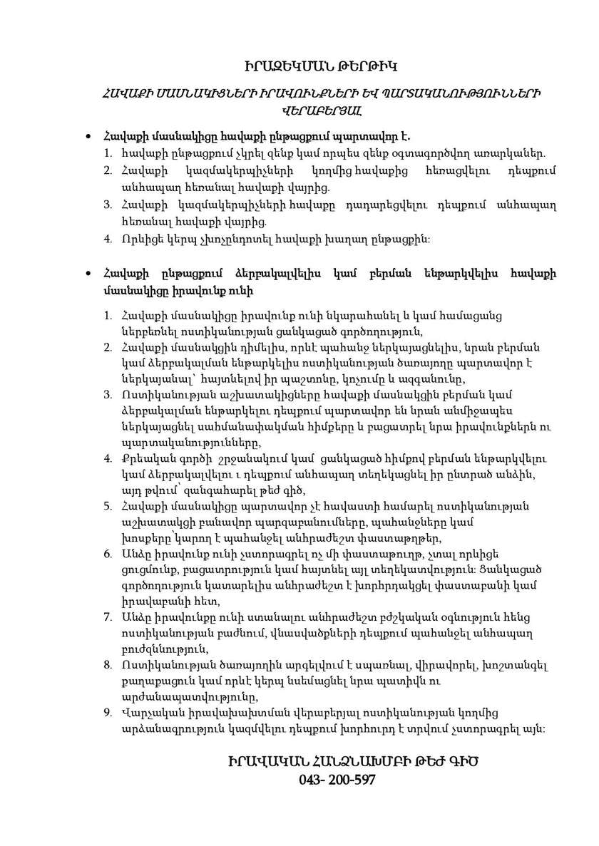 Հայրենիքի փրկության շարժման իրավական հանձնախումբը սույնով ներկայացնում է հավաքի մասնակիցների իրավունքների և պարտականությունների վերաբերյալ իրազեկման թերթիկը, որը թույլ կտա ավելի արդյունավետ կազմակերպել ձեր իրավունքների և ազատությունների արդյունավետ պաշտպանությունը։