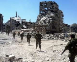 28,07,2013. Սիրիական կառավարական զորքերը շրջայց են իրականացնում Հոմս քաղաքում գրոհայիններից ազատագրված Հալիդիա թաղասում: