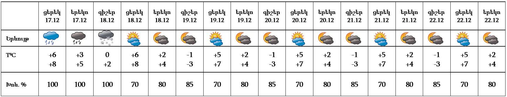 Երևան քաղաքում՝ դեկտեմբերի 17-ի ցերեկը, 18-ի գիշերը ժամանակ առ ժամանակ սպասվում են տեղումներ, 18-ի գիշերը քաղաքի բարձրադիր գոտում թաց ձյան տեսքով։ Դեկտեմբերի 18-ի ցերեկը, 19-22-ը սպասվում է առանց տեղումների եղանակ։ Գիշերը և առավոտյան ժամերին սպասվում է մառախուղ։