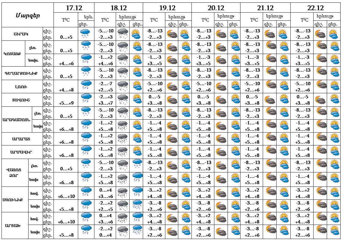 Հանրապետության տարածքում՝ դեկտեմբերի 17-ի ցերեկը, 18-ի գիշերը ժամանակ առ ժամանակ շրջանների զգալի մասում, 18-ի ցերեկը Վայոց ձորում, Սյունիքում և Արցախում սպասվում են տեղումներ՝ լեռնային և նախալեռնային շրջաններում՝ ձյան տեսքով։ Դեկտեմբերի 19-22-ը սպասվում է առանց տեղումների եղանակ։ Առանձին վայրերում սպասվում է մառախուղ: