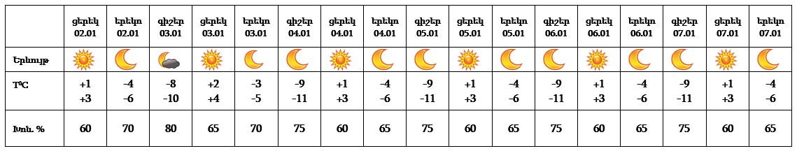 Հունվարի 2-ի ցերեկը, 3-7-ը սպասվում է առանց տեղումների եղանակ։ Քամին՝ հյուսիս-արևելյան՝ 5-10 մ/վ: