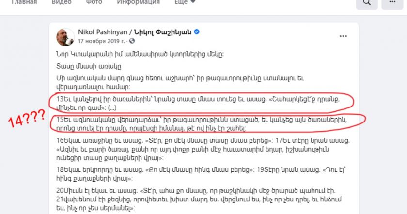 Հ.Գ. Որպեսզի իմանաք, թե ինչպես ա փաշինյանը մեջբերում Աստվածաշունչը, պարզապես հիշեք, որ անցած տարի` նոյեմբերի 17-ին, երբ որոշել էր քրիստոնյա ձևանալ և էլի մեջբերումներ անել Սուրբ գրքից, գրել էր «Տասը մնասի առակի» մասին և, ուշադրություն, խմբագրել էր Ղուկասի Ավետարանը, հանել է 14-րդ կետը։ Իսկ Ղուկասի Ավետարանի 19-րդ գլխի 14-րդ կետում ասվում էր.