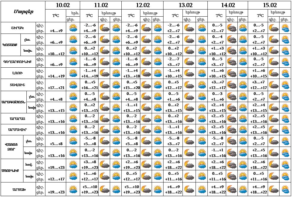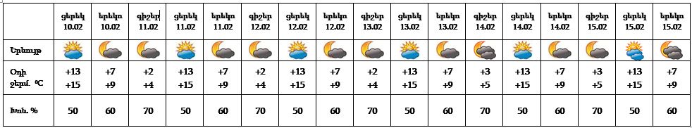 Հանրապետության տարածքում՝ փետրվարի 10-ի ցերեկը, 11-15-ը սպասվում է առանց տեղումների եղանակ: Այս մասին հայտնում են ԱԻՆ-ից։