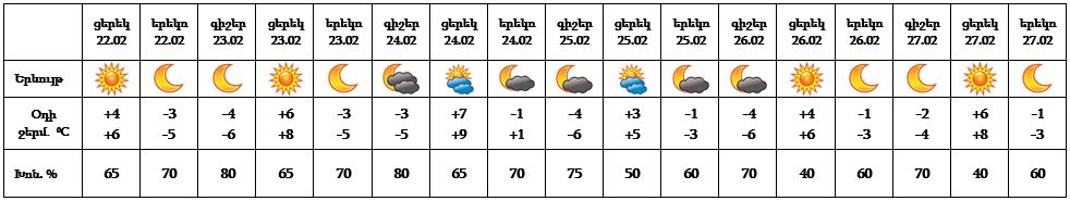 Հանրապետության տարածքում՝ փետրվարի 22-ի ցերեկը, 23-ին, 24-ի գիշերը, 25-ի ցերեկը, 26-27-ը սպասվում է առանց տեղումների եղանակ: Փետրվարի 24-ի ցերեկը, 25-ի գիշերը առանձին շրջաններում սպասվում է ձյուն։