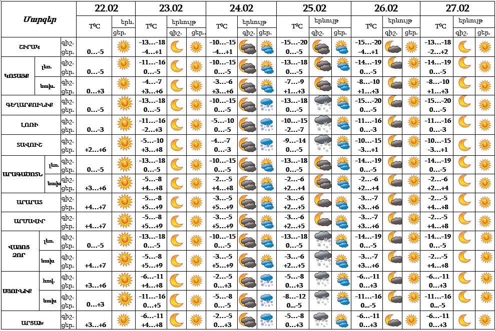 Քամին հյուսիս-արևելյան 5-10 մ/վ: Օդի ջերմաստիճանը փետրվարի 23-ի ցերեկը կբարձրանա 2-4 աստիճանով։