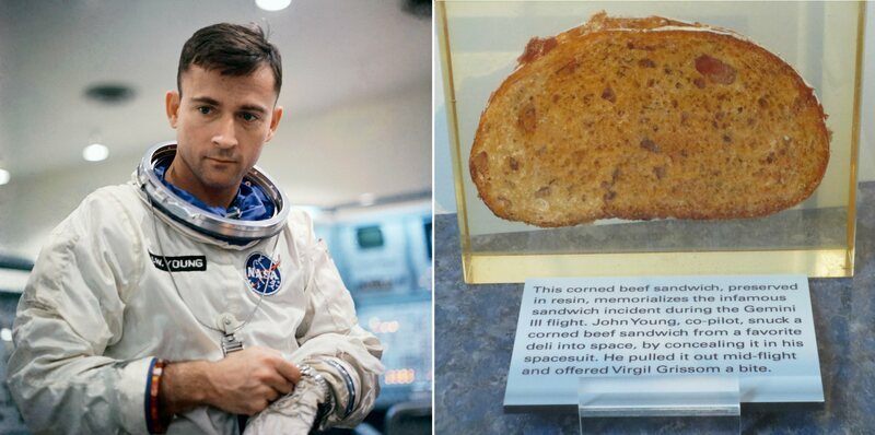 Տիեզերքում խստորեն արգելվում է սովորական սնունդ ընդունել։ Դրա փոխարեն տիեզերագնացներն իրենց հետ փոքրիկ խողովակներով սնունդ են վերցնում։ 1965 թ. տիեզերագնաց Ջոն Յանգը որոշեց իր հետ տավարի մսով սենդվիչ տանել Տիեզերք, քանի որ տիեզերավում նրան առաջարկվող սնունդը չէր հավանում։ Սենդվիչը նա գաղտնի էր իր հետ վերցրել, սակայն դա մեծ սխալ էր, որը կարող էր շատ կյանքեր արժենալ։ Բանն այն է, որ սովորական սննդի փշուրները կարող են մնալ տիեզերանավի սարքավորումների մեջ և անսարքություններ առաջացնել։ Դրան գումարվում է նաև ավելորդ խոնավությունը։ Բարեբախտաբար էչ մի ցավալի իրադարձություն տեղի չունեցավ. հայտնի սենդվիչն այդպես էլ չկերան, և այն այսօր գտնվում է թանգարանում։