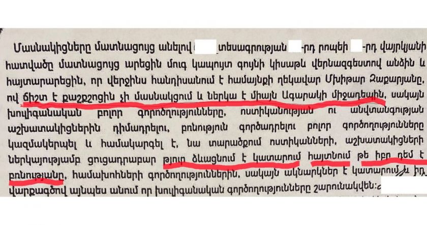 Ոստիկանության մի քանի աշխատակից մասնակցելով տեսանյութերի զննություններին և տեսնելով, որ Մխիթար Զաքարյանը բացի հանդարտեցնելը որևէ այլ բան չի անում, որ նա որևէ խուլիգանական գործողություն չի կատարում, ստիպված հայտարարում են, որ ճիշտ է՝ նա չի մասնակցում քաշքշոցին, միայն ներկա է դրան, ավելին՝ տեղում հայտնում է, որ դեմ է բռնությանը, սակայն հանկարծ էքստրասենս ոստիկանները պնդում են, որ նա դա ձևացրել է և իր հանդարտեցնող գործողություններով իրականում այնպես է արել, որ այդ խուլիգանական գործողությունները շարունակվեն։